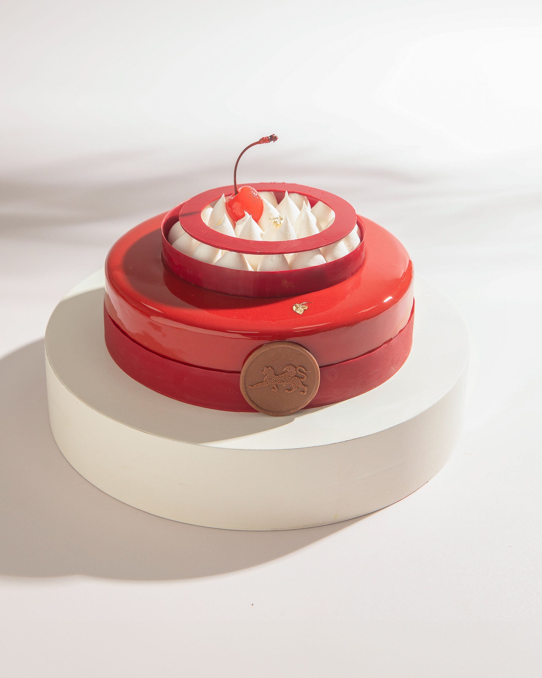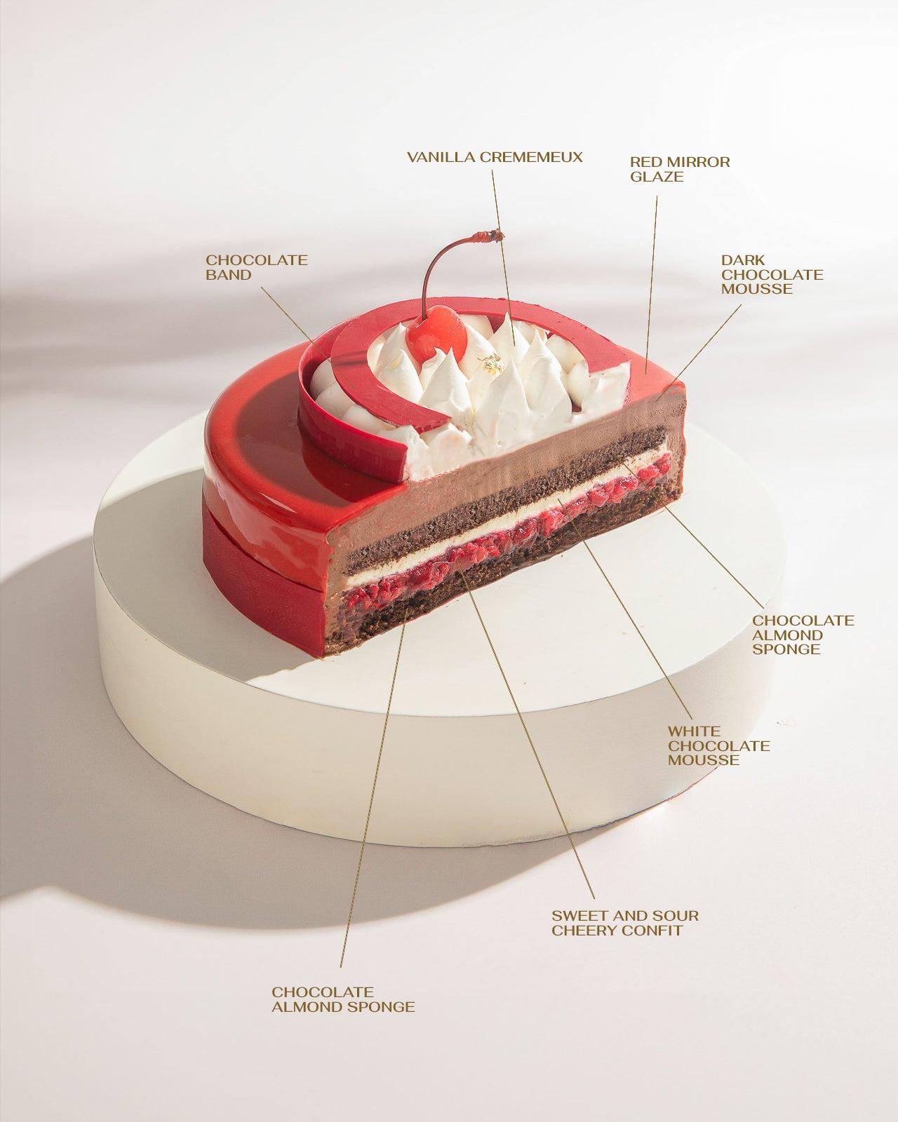 A timeless classic reimagined — layers of rich chocolate–almond sponge with sweet-and-sour cherry confit, embraced by velvety white and dark chocolate mousse. Enrobed in a glossy cherry–white chocolate glaze and topped with delicate vanilla crémeux, this entremet is an elegant celebration of chocolate and cherries in perfect harmony.
