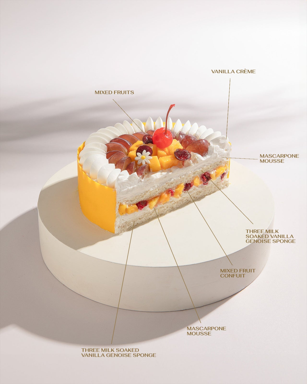 A rich indulgence — moist genoise sponge soaked in a trio of luscious tres leches milk, layered with mixed fruit compote and velvety mascarpone crème. Topped with fresh seasonal fruits and vanilla Chantilly , this dessert is a vibrant, indulgent celebration of creamy textures and natural fruit sweetness.