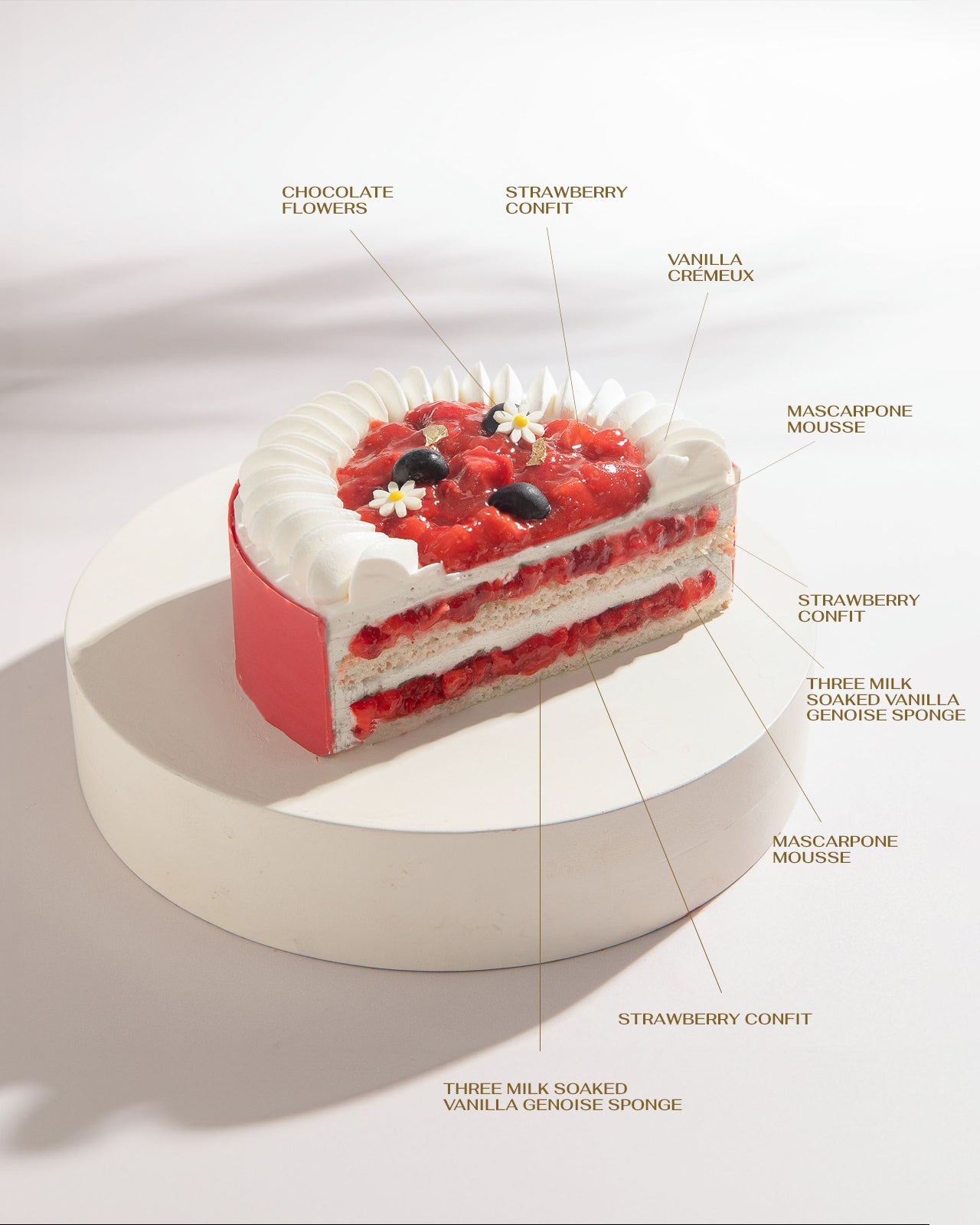 Soft vanilla genoise sponge soaked in 3 types of tresleches milk, layered with strawberry confit and light mascarpone mousse. Built in two layers for extra indulgence and topped with more strawberry confit and vanilla Chantilly. It tastes just like a classic strawberry milkshake—only better, and made to celebrate