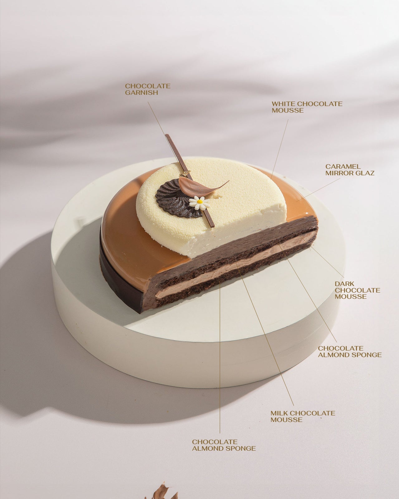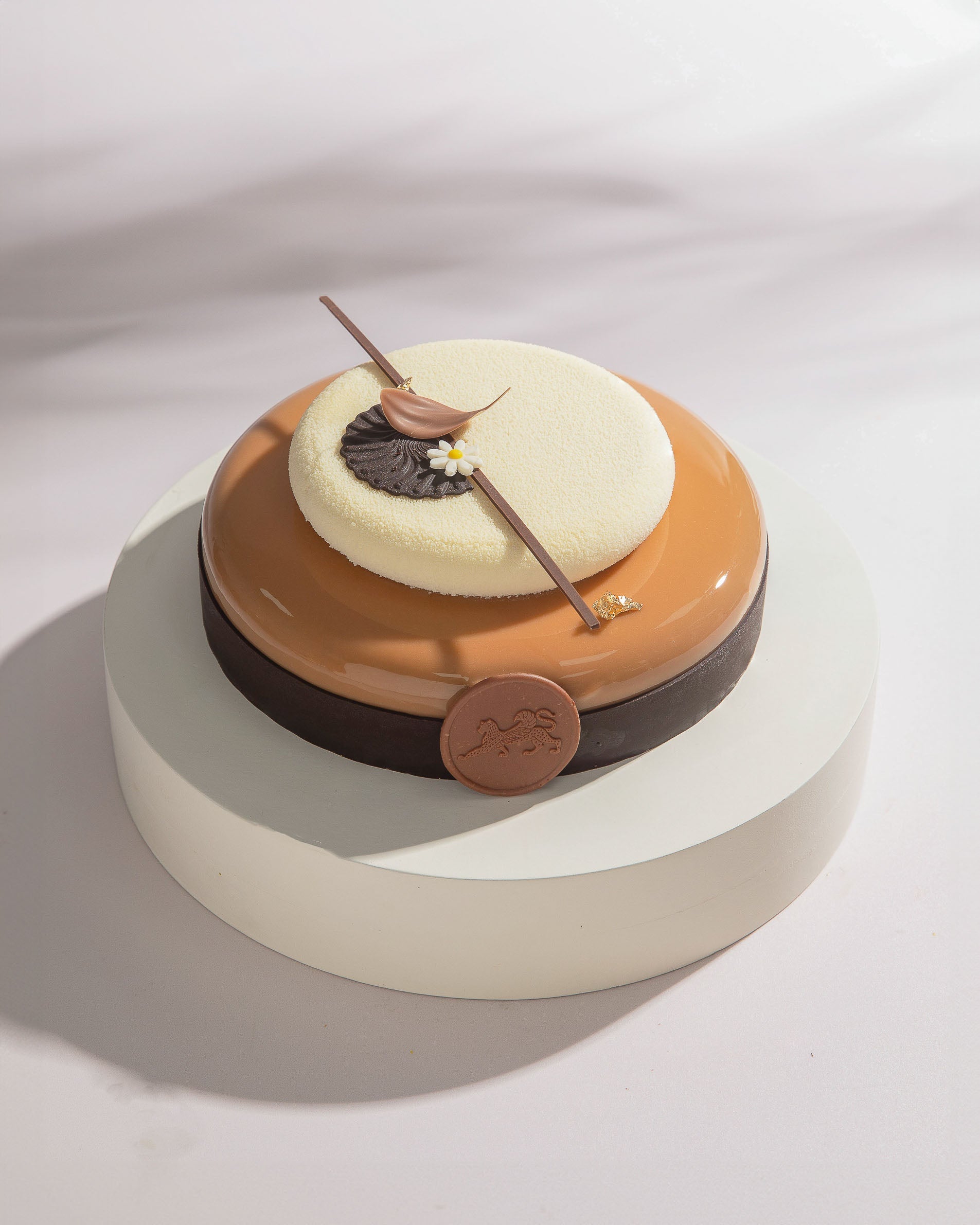 An exquisite entremet layered with velvety dark, milk, and white chocolate mousses, between soft chocolate almond sponge. Mirror glazed in a caramelized white chocolate . The taste of infinite Italian indulgence
